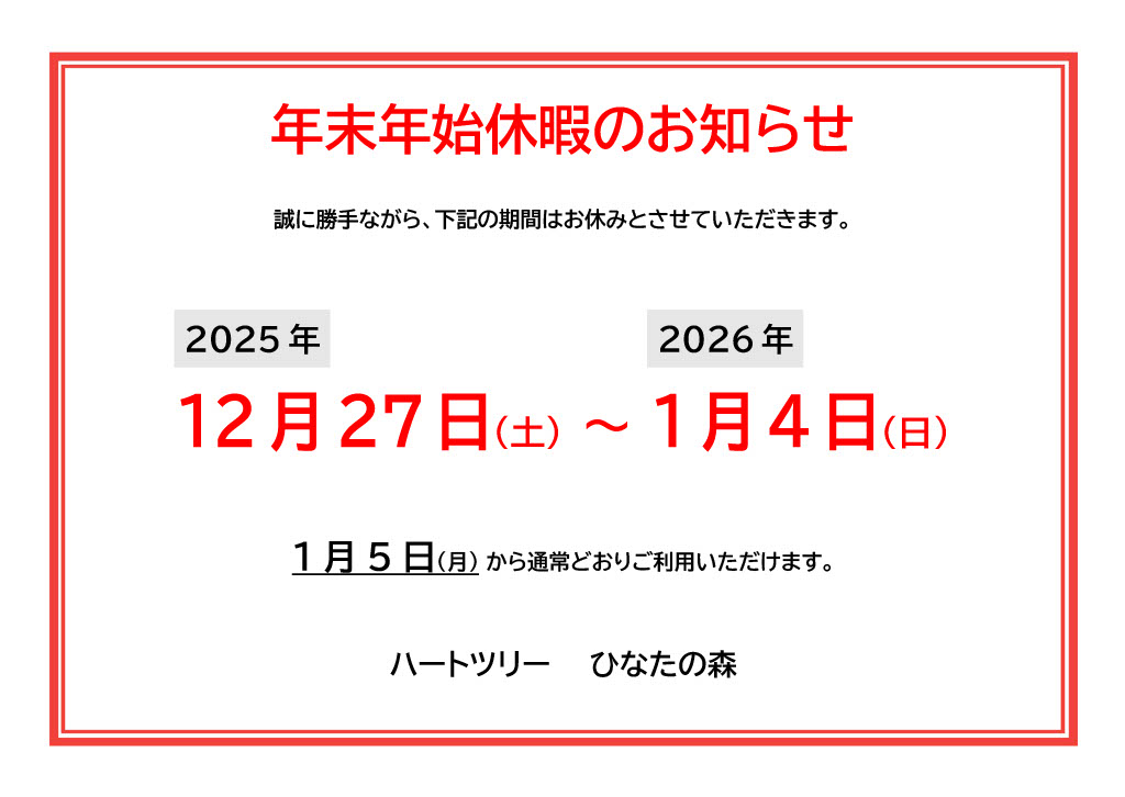 2025年12月2日 / 最終更新日時 : 2025年12月2日 ht_admin お知らせ ハートツリー 2025年度年末年始休暇のご案内 誠に勝手ながら、12/27(土)~ 1/4(日)はお休みとさせていただきます。1/5(月)から通常どおりご利用いただけますので、どうぞよろしくお願いいたします。※あづまプラッツに関しても、上記と同様の日程です。 Follow me!